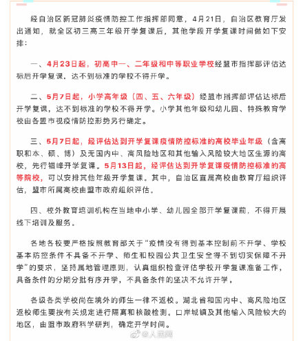4月21日,内蒙古自治区教育厅发出通知,就全区初三高三年级开学复课后,其他学段开学复课时间做如下安排: