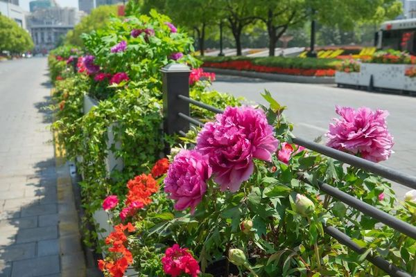 而在黄浦区人民大道,中央隔离带的花箱则种植了各色牡丹。这次牡丹全部来自洛阳,是“血统纯正”的洛阳牡丹,包括“洛阳红”、“雪映桃花”、“花王”等。
