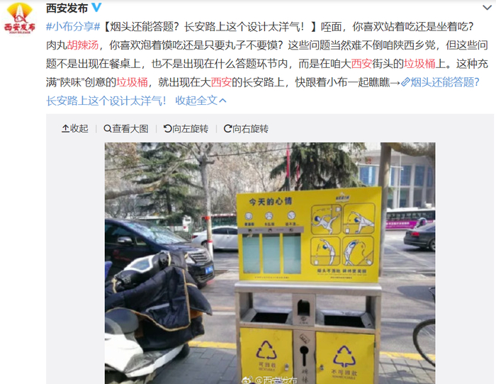 西安的垃圾桶,已经不是第一次成“网红”了。2018年,为了解决乱扔烟头的问题,当地就设计了一种垃圾桶,每个垃圾桶上放三个烟头收集箱,写上不同的文字。比如有一种,就是“肉丸胡辣汤我喜欢——泡着馍吃、就着馍吃、来丸子不要馍”,喜欢哪种胡辣汤,就把烟头投入哪个箱中。在博得众人一乐的同时,周边环境也整洁了。