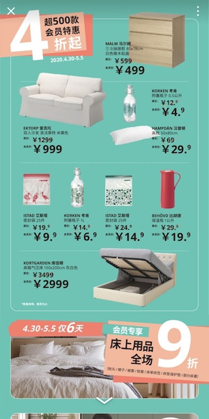 在宜家家居,“焕新优惠”抵用券就有五档。其中,最低的一档,花19元可以购买268元的抵用券(购物满3千元使用);而花199元购买的抵用券,达3688元(购物满3万元使用)。