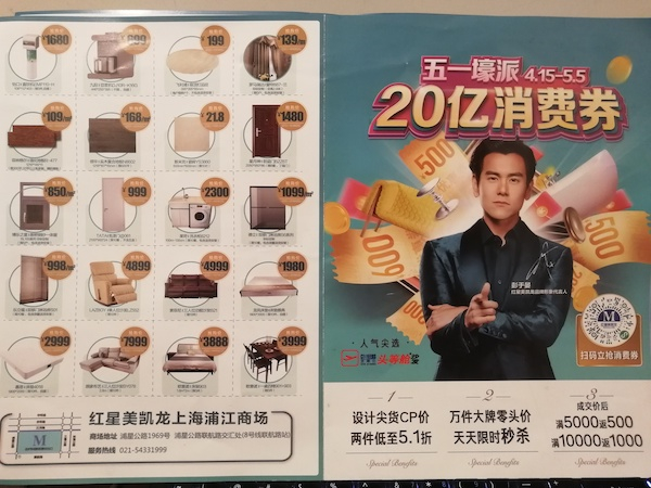 类似抵用券,也出现在红星美凯龙。那里,既有“200元升400元”(相当于花200元可以买400元的抵用券)的“订金膨胀券”,也有可以“秒抢”的300元建材券,还有“满5000返500”,“满10000返1000”的“品牌消费券”。