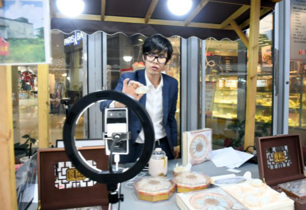 图说:金山区副区长张权权“客串”网络主播,搭档歌手袁成杰一起启动造势。陶磊 摄(下同)