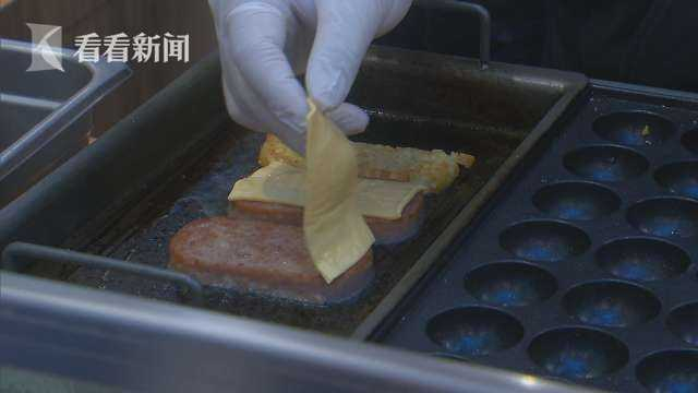 上午十点,日月光商场刚刚开门,位于B2层中庭的上海梅林快闪店就吸引了不少市民围观,主播正通过线上直播,给观众介绍午餐肉制成的创新料理。两片红肉、加上芝士片和土豆饼,在油锅里一煎,再用紫菜卷一包,短短几分钟,色香味俱全的午餐肉寿司就新鲜出炉了,现场的消费者还能移步一旁的门店立刻享用这份美味。