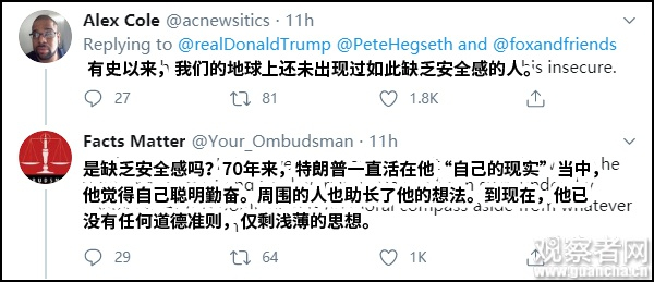 (截自 特朗普推文下方留言 翻译:观察者网)