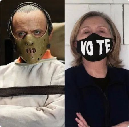 另有网友注意到,这张漆黑的口罩大到几乎盖住希拉里半边脸,结合她双手抱在胸前的姿势与拍摄角度,其气场令人与电影中戴面罩的反派角色联系起来。