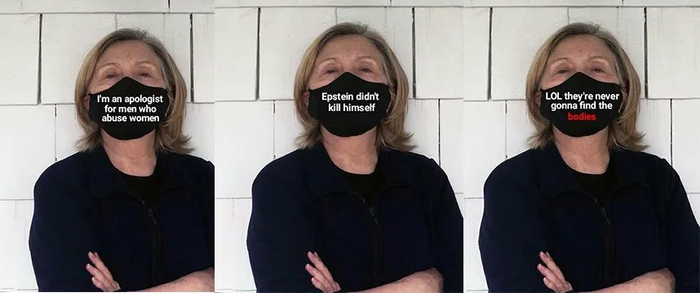 他们中有人在口罩上PS希拉里过去的“黑历史”,比如涉及民主党全国竞选委员会的电子邮件、对待关塔那摩虐俘丑闻的态度等。还有的干脆写道,“我为男人霸凌女性辩护”(影射克林顿性丑闻),“爱泼斯坦不是自杀”(此人被控性侵未成年少女,但入狱后自杀,有阴谋论认为系与他关系密切的克林顿夫妇背后主使)、“他们永远找不到尸体”等。