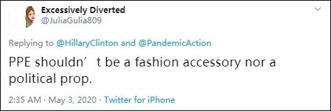 特朗普的老对手、前民主党总统候选人希拉里也加入到呼吁的行列。5月2日,她在社交媒体上发布自己戴口罩的一张自拍,表示“不化妆、不穿长裤套装都不是问题”,但春日出游“口罩是必备”,呼吁人们注意防护。