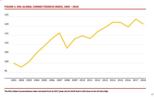 根据各国国际性联系的深度(要素流动的强度)和广度(要素流动的地理分布),DHL2018全球联结指数(GCI)以贸易、资本、信息和人员的国际性流动为衡量标准,发现这个指数在2001~2018年间就增长了20%(参见下图),可见全球化速度之快。