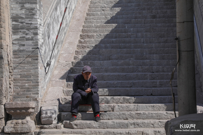 老人在玉皇阁台阶上坐着晒太阳,时间缓慢流淌。