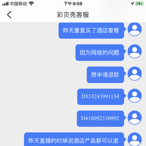 消费者“用户7451985322”在5月6日向黑猫投诉平台反映:“彩贝壳4/25直播了三小时、卖了很多产品,我也是它的忠实用户、也跟风买了很多,CEO在吆喝的时候说了所有得产品在直播的时候购买没用都是可以退款的,而且在卖长颈鹿庄园酒店这个产品时候、由于网络的关系,下单付款后App平台上并没有出现已购买的订单,CEO说是网络问题、稍后重新购买,所以后来又买了,CEO特地强调说买的这些产品都是可以退款的,而且买的时候必须要选择日期,所以就随便选了一个,当时直播的时候说是可以退改的,所以就想着反正不怕,但是随便选好以后我就不能自己操作退改了,想联系客服,但是那天直播时间很晚了10点多了,客服都下班了,我只能等到第二天一早8:30就来找客服,可惜客服还没上班,我9点等客服上班后再联系他们,可惜一直没人回应、打电话也打不通,一直到晚上才等到客服回应,那时候订单已经被确认了,客服说不能退,我告诉他是网络问题导致的多买,且当时说了可以退,这么快说酒店已经确认了却一天没有客服回应我们的提问和要求退款,这不是欺诈吗?”