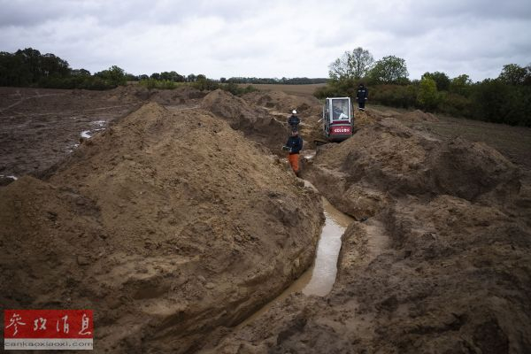 东欧阵亡者遗体回收协会会长劳厄在德国克莱辛村一条沟渠中,寻找二战阵亡士兵遗体。(美联社)