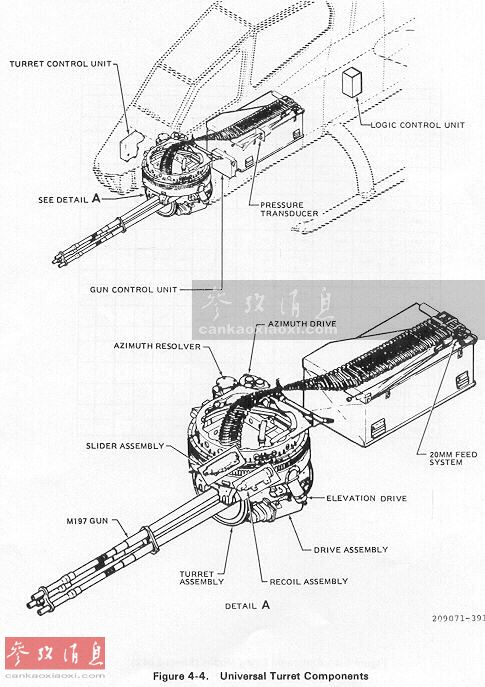 M197使用M940多用途弹药时,可击穿518米距离外12.5毫米厚的均质装甲(RHA),940米时的穿甲厚度则为6.3毫米。图为M197速射炮结构示意图。