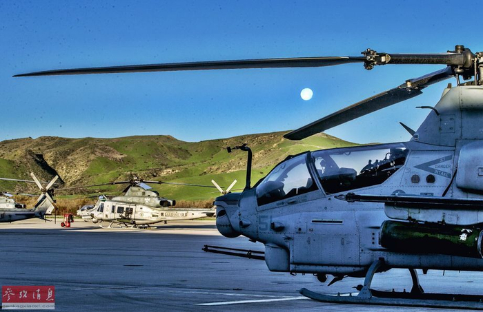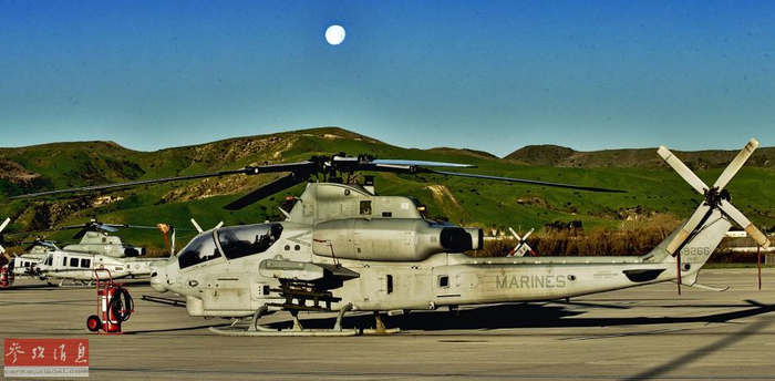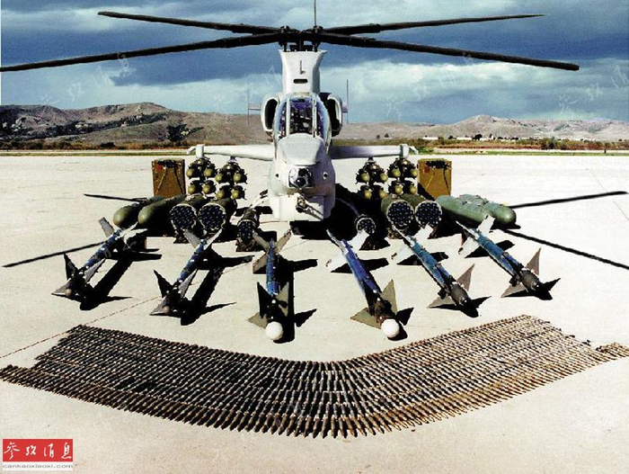 图为AH-1Z进行地面武器展示的宣传照,画面从近至远依次为20毫米机关炮弹药、“响尾蛇”空空导弹、火箭发射巢和副油箱,以及短翼下的16枚地狱火反坦克导弹,单机火力已可与美陆军的“阿帕奇”重型武直媲美。