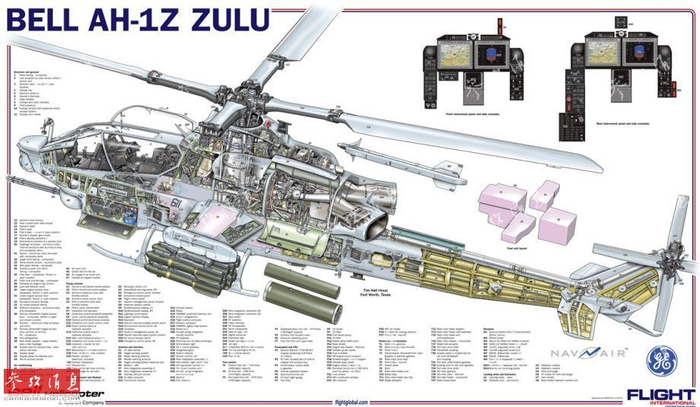 AH-1Z“蝰蛇”(Viper,又称“祖鲁眼镜蛇)则是美陆战队装备“眼镜蛇”系列的最新型号,该型机是美军“H-1升级项目”的一部分。相比AH-1W,该型机进行了大幅改进,换装了新型四叶复合材料旋翼,更大功率发动机,和更强的武器系统,以及先进数字化”玻璃“座舱。该型机于2010年9月投入服役,美军正逐步将AH-1W机群升级到Z型的标准。图为AH-1Z的结构图。