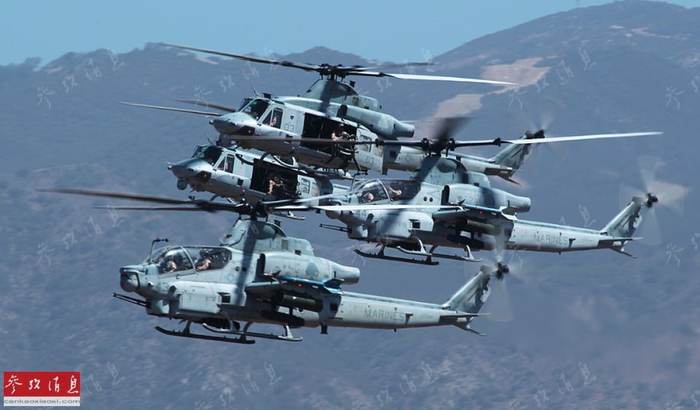 美海军陆战队AH-1Z武直与UH-1Y运输直升机宣传图特写。