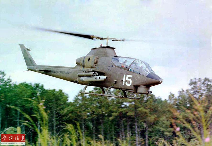图为越战时期,正在低空飞行的AH-1G,短翼下挂有火箭巢和机炮吊舱。
