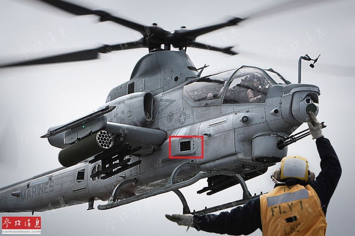 AH-1Z于2006年第一季度完成了作战评估测试,现已在阿富汗战场投入实战。图为一架AH-1Z即将在马金岛号(LHD-8)两栖攻击舰上着陆。注意Z型的热焰弹发射器已移至机身侧面(红框处),机身挂架数量由W型的4个增至6个(增加了2个翼尖挂架),机头传感器也由传统的TSU探头,变成了新型球形多功能传感器。