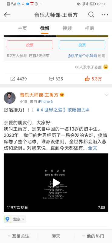 这是他用微博发出的邀请,里面有他想和你一起唱的——《世界之爱》。