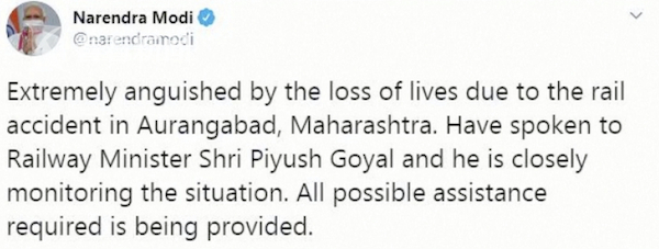 当地警方表示,这些人原本是想要沿着铁轨走回家,惨剧发生时他们正在铁轨上休息。目前警方正在设法查明这些工人的身份。印度总理纳伦德拉·莫迪在社交媒体上发文表示,他“对于这些逝去的生命感到非常痛心”。