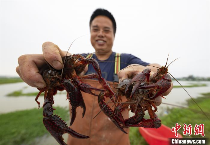5月9日,江西省新余市高新区水西镇珍田村700亩稻虾养殖基地,致富带头人胡云平展示“扶贫虾”。 赵春亮 摄