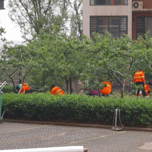工作人员在4号楼南侧小花园内清理杂物。陆祁国 摄
