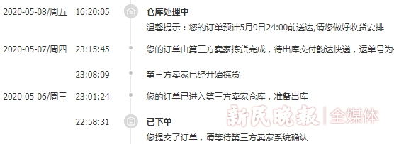 然而,记者一次次查询“订单详情”发现,这个订单,虽然在5月6日23∶01就“进入第三方卖家仓库,准备出库”了,但直至5月7日23:08,第三方卖家才开始拣货,至5月8日16:20才交给韵达快递运输。