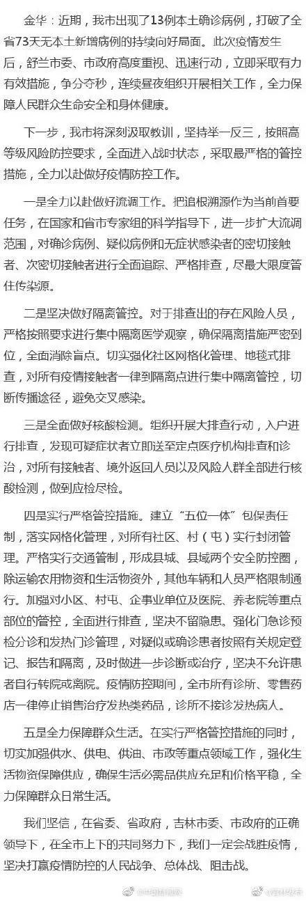 5月11日,吉林省在舒兰就最新疫情情况召开视频发布会,舒兰市市长金华表示,近期,舒兰市出现了13例本土确诊病例,打破了全省73天无本土新增病例的持续向好局面。下一步,按照高等级风险防控要求,全面进入战时状态,采取最严格的管控措施,全力以赴做好疫情防控工作。