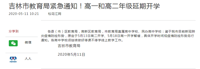 早前,舒兰市要求已经复学的高三、初三年级学生恢复网上授课模式,停课不停学。吉林省公主岭市教育局也于5月10日发布公告称:“为确保广大师生健康安全,原定于5月11日全市高中高一、高二年级(中等职业学校一、二年级)开学取消,具体开学时间另行通知。”
