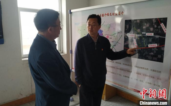 青岛市委组织部副局级干部、张东村支部书记姜勇向青岛橡胶谷集团董事长孙思波介绍张东村情况。 胡耀杰 摄