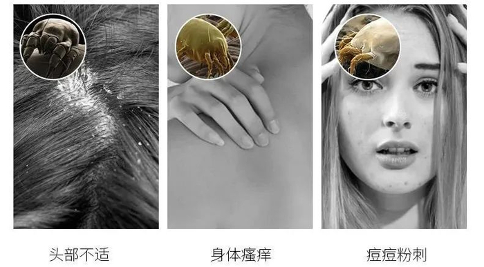 螨虫是肉眼看不见的小虫,被单、枕巾、沙发、脸上、四肢、头发里都有可能有它们。它的繁衍速度超快,分泌物、排泄物则是我们肌肤的过敏源,可导致大片皮肤瘙痒、冒痘、甚至痤疮。