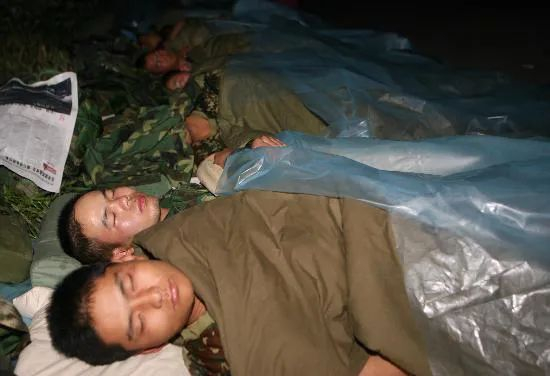 ▲2008年5月15日凌晨,参加抗震救灾的济南军区某部战士在汶川县映秀镇街头休息。