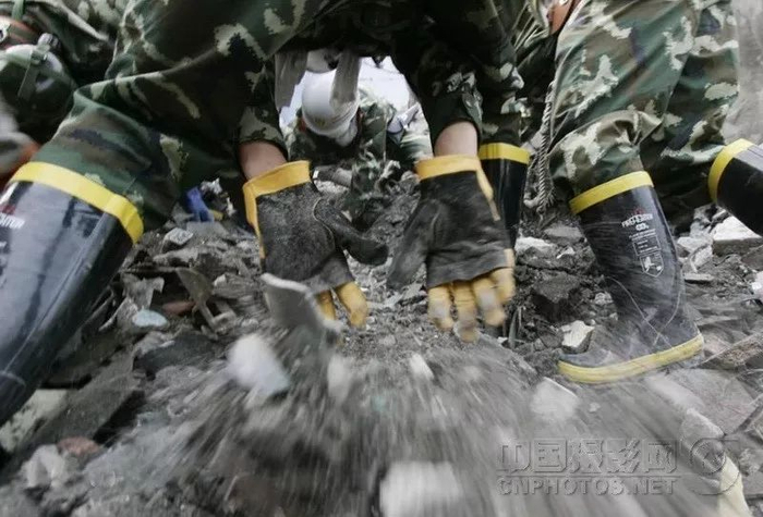 绵竹的武都小学教学楼坍塌,至少埋压了100多个师生。钢筋和楼板摇摇欲坠,残存的墙体时不时往下掉,19岁的战士荆利杰全然不顾。手掌磨破了,没有想到去消毒;手指头出血了,没有想到去包扎;脚底被钢筋刺破了,根本没有停下来的意思……
