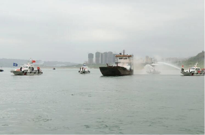 海事部门接到险情报告后,立即向江安县政府、宜宾海事局报告并组织长江航道、长航公安和地方交通航务公务船艇及人员赶往现场处置险情。10时25分,宜宾南溪海事处“海巡12276”与宜宾江安海事处“海巡12277”达到事发水域并立即形成两道落水人员拦截救援网,海事执法人员利用先进的自动救生设备成功将落水人员救上“海巡12276”后,立即对落水人员进行心肺复苏和人工呼吸救助,落水人员恢复生理特征后,迅速将其送到了在码头等待的120医疗救护车。10时35分,长江海事部门“海巡12276”“海巡12277”艇,长航公安部门“巡警01-02”和长江航道部门“叙道标206”“叙道标203”艇对“祥云077”机舱失火位置进行进行全力灭火,经过约20分钟的消防救援,船舶火势成功被扑灭。10时51分,“叙道标206”“叙道标203”对船舶失控的“祥云077”人员进行了安全转移,并将船舶安全助推到“长宁1号趸”进行了捆绑,成功应对了船舶失控险情。最后,南溪海事处处长田茂祥对此次演练进行了应急救助专业点评,王文华副县长进行了总结讲话,经过近1个小时的应急演练,宜宾市江安县2020年“5.12防灾救灾日”水上综合救援演练圆满结束。