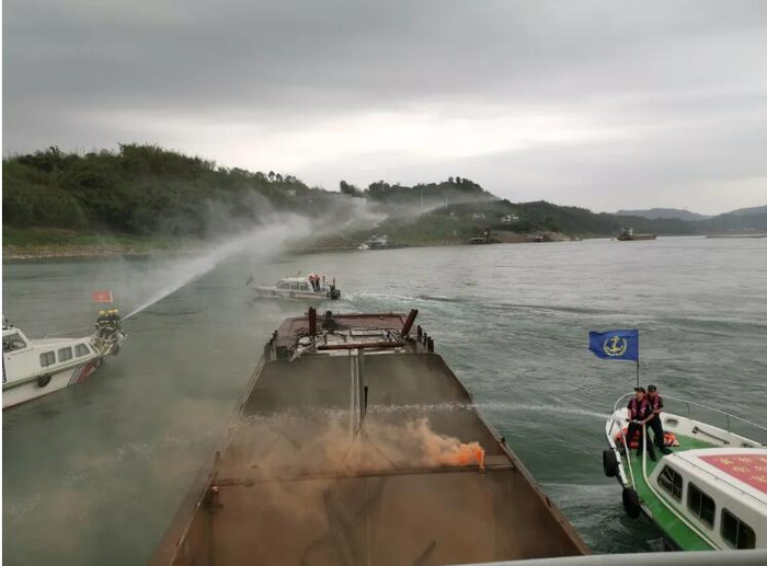 演练模拟至10:12时许,长江水位陡涨,江面漂浮物增多,“祥云077”船舶上行至江安县香炉滩码头水域时,螺旋桨被杂物缠绕导致船舶动力不足,该船立即采取紧急应对措施,立即报告海事部门并拟靠泊“长宁1号趸”,期间1名作业船员不小心踢绊船舶钢绳不慎落江,船长立刻抛投救生圈进行自救。同时,由于长时间大油门操作船舶主机,造成机舱高压油管爆裂引发机舱失火。随即,船舶失去动力,船舶处于失控状态并顺水流向下游漂流,可能撞击江安长江大桥。
