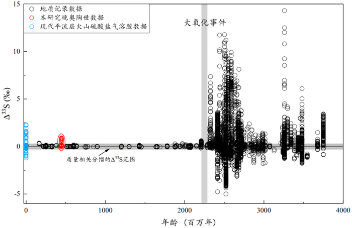 针对这一科学问题,沈延安课题组开辟了新的研究思路,他们对华南奥陶纪末生命灭绝地层中的黄铁矿进行了高精度同位素分析,发现伴随着晚奥陶火山的喷发,硫同位素出现非质量分馏,当火山活动减弱和停滞后,硫同位素又呈现质量分馏。奥陶纪末非质量硫同位素记录的发现是23亿年以来地质记录中的首次报道(下图)。因此他们提出奥陶纪末火山活动为“平流层火山喷发”并触发和驱动了当时的生命灭绝事件。