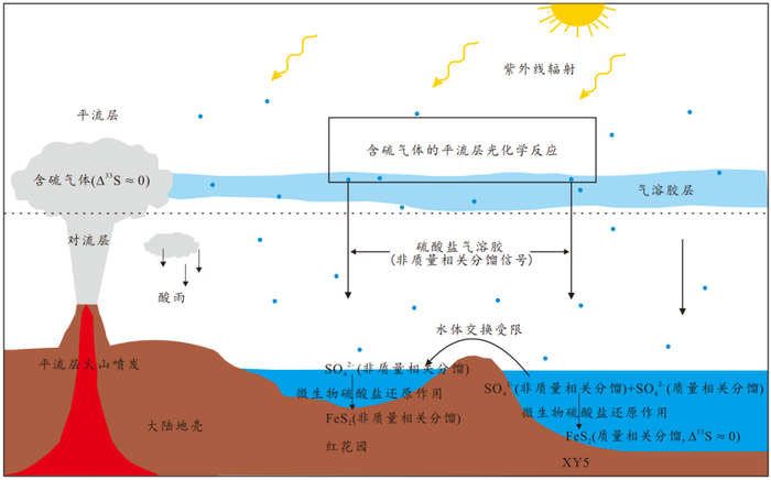 该研究认为,奥陶纪末“平流层火山喷发”将大量二氧化硫、硫化氢和其它火山物质输送至平流层并形成了以硫酸盐为主的气溶胶层(下图)。硫酸盐气溶胶层对全球气候变化和地球系统的热量平衡起着至关重要的作用,因为平流层硫酸盐气溶胶反射短波的太阳辐射、同时吸收长波段的太阳辐射,从而导致地球表面温度下降(即加热自己,冷却地球)。在平流层的臭氧层附近,火山喷发的二氧化硫等含硫气体经光化学反应产生硫同位素的非质量分馏,并形成硫酸盐等沉降至地表和海洋中,最后保存于岩石中。经过短暂的冷却之后,“平流层火山喷发”释放大量温室气体使地表温度迅速升高并形成酸雨,导致陆地和海洋酸化以及海洋缺氧。因此,他们提出“平流层火山喷发”触发和驱动的一系列全球气候剧烈变化和海洋缺氧等环境恶化,直接导致了奥陶纪末生命大灭绝。