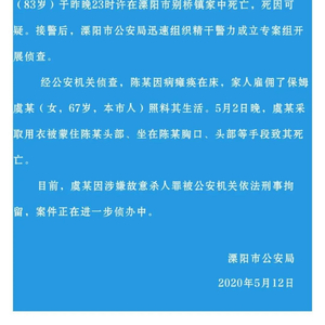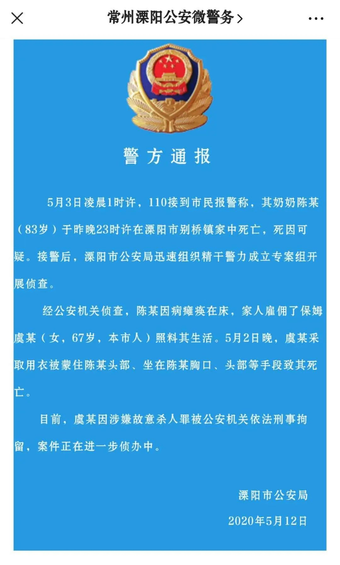 5月12日,溧阳市公安局发布的警情通报显示,5月3日凌晨1时许,110接到市民报警称,其奶奶陈某(83岁)于昨晚23时许在溧阳市别桥镇家中死亡,死因可疑。