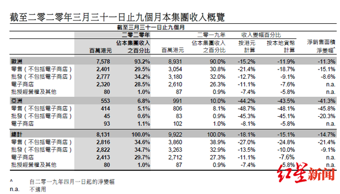 记者查阅思捷环球财报发现,截至2020年3月31日的三个季度内,56间ESPRIT店铺营收仅有2.67亿港元,占同期集团总收入不到4%。而整个2019年财年,思捷环球实现营收129.32亿港元,同比减少16.3%,其中亚洲市场收入只占集团总收入的9.5%;期内净亏损21.44亿港元,同比增长16.1%。