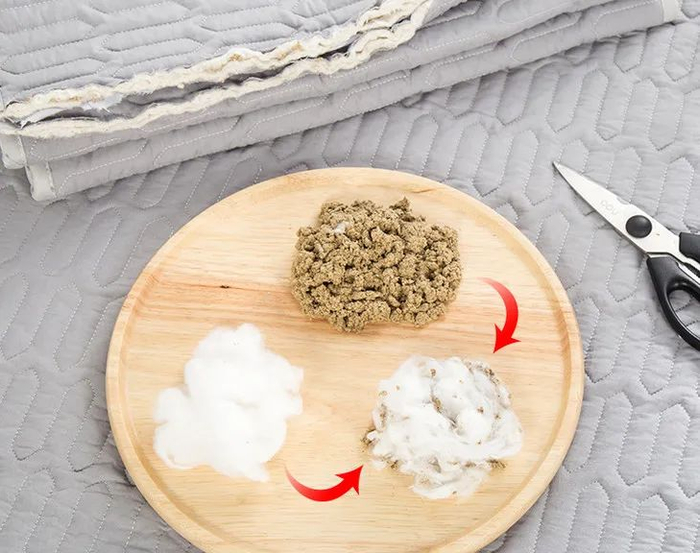 为了固定艾绒、提高舒适度,平直堂一直在研究艾绒和棉花的配比。这款床垫,他们特地选用新疆长绒棉+2斤艾绒来做。
