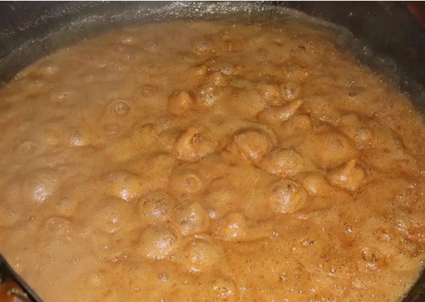 甘蔗榨成汁后,再将过滤好的青绿色甘蔗汁,注入到锅内,明火熬制,变成冒着泡的红糖浆。
