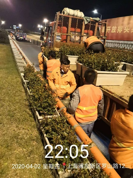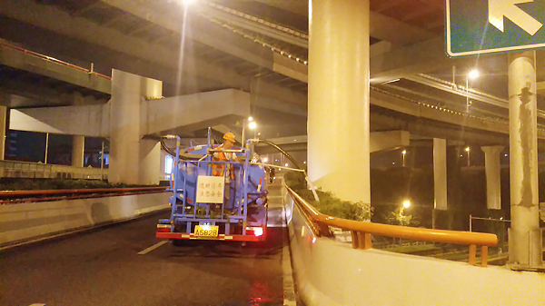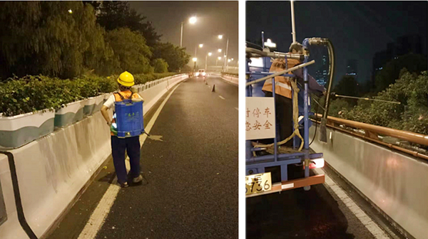 “深夜12时以后,高架会分段封路,上面有很多支队伍在忙碌。绿化养护队伍也是其中一支,浇水、施肥、除草都在争分夺秒进行。”张浩说。