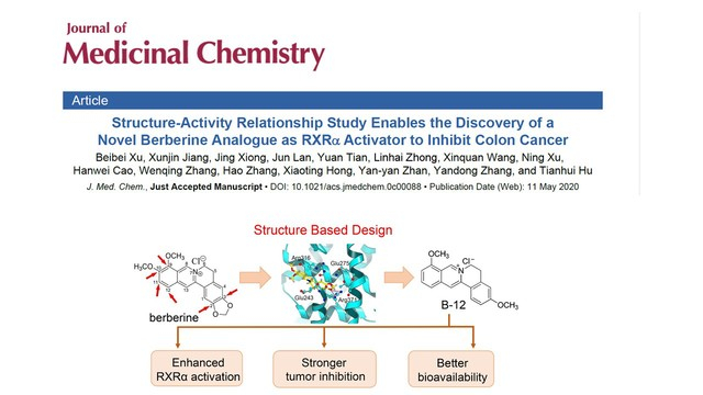 胡天惠教授研究团队长期从事黄连素抗肠癌机制的研究,并首次发现视黄醇X受体(RXR)是黄连素的细胞内靶点(Oncogene 2017, 36: 6906-6918)。而张延东教授团队近些年在活性天然产物全合成领域取得一系列重要进展(https://zhanglab.xmu.edu.cn/publications/)。在上述研究基础上,胡天惠团队与张延东团队紧密合作、优势互补,针对黄连素与RXR的结合模式,运用结构生物学方法和全合成相结合,设计合成了多种黄连素衍生物,并开展了构效关系分析。发现黄连素衍生物B-12在结合并激活RXR、抗肠癌活性、溶解度和生物利用度方面均明显优于黄连素,且保留了黄连素的肿瘤选择性和低毒副作用,具有很好的临床转化前景。
