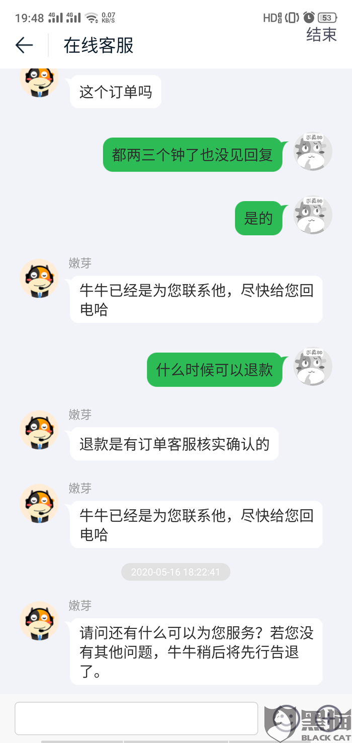 消费者“用户7451900443”在5月17日向黑猫投诉平台再次反映:“途牛客服说专员回复 昨天到今天才回复说又知道什么时候才可以退款 就一句话等 没有时间的等”