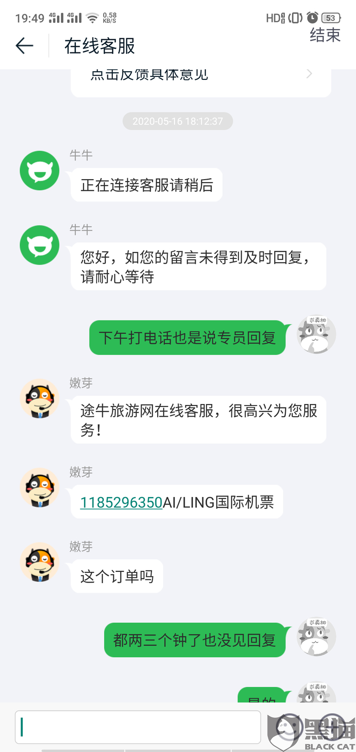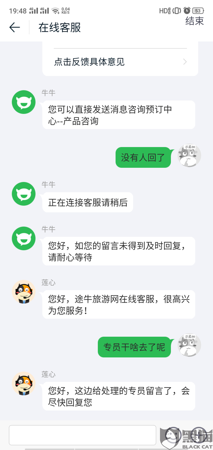 黑猫投诉:退款一直没有人回复 要求途牛退款