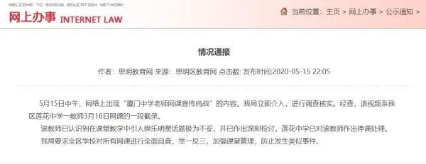 15日晚,厦门市思明区教育局在“思明教育网”发布通报称,经查,网传视频系该区莲花中学一教师3月16日网课的一段截录。该教师已认识到在课堂教学中引入娱乐明星话题极为不妥,并已作出深刻检讨。莲花中学已对该教师作出停课处理。