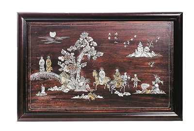 笔者曾在上海的古玩市场购得一件清红木螺钿挂屏,材质是老红木,釆用螺钿工艺镶嵌制成图案,甚为精致典雅。清初出现的挂屏多代替画轴在墙壁上悬挂,成为一种纯装饰性的品类,具有很高的艺术价值和收藏价值,深受民众喜爱。