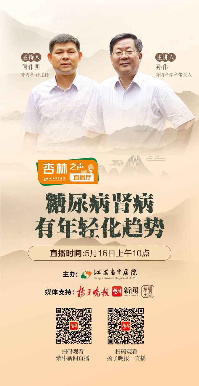 “杏林之声·直播厅” “当班主播”是来自江苏省中医院肾内科学科带头人孙伟主任医师与肾内科科主任何伟明,他们提醒患者,糖尿病对肾脏的损害,从患病的第一天就开始了,早看肾科才能晚得肾病。