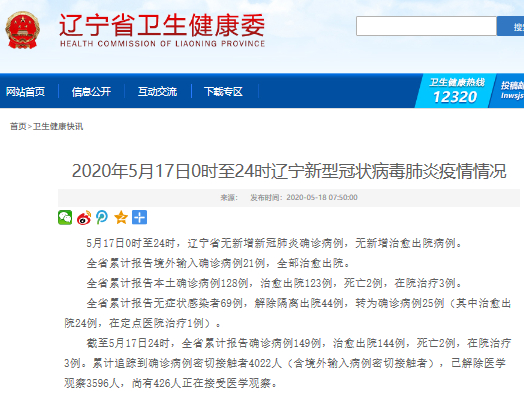 5月17日0时至24时,辽宁省无新增新冠肺炎确诊病例,无新增治愈出院病例。