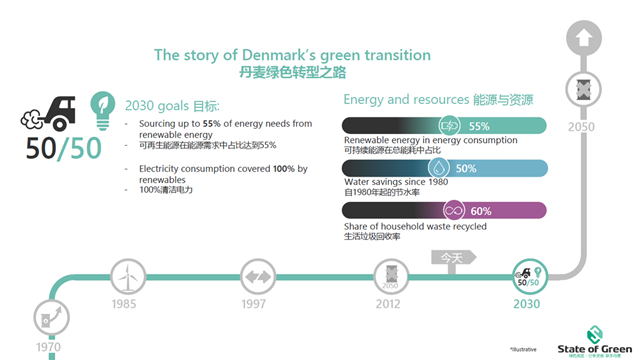 此外,丹麦还提出了一个更宏大的目标:到2050年完全摆脱化石燃料,实现低碳零化石燃料社会,可持续能源在总能耗中占比100%。