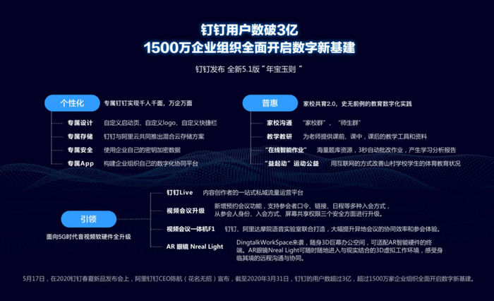 5月17日,2020钉钉春夏新品发布会上,钉钉CEO陈航公布了疫情之后的成绩单:截至2020年3月31日,钉钉的用户数超过3亿,超过1500万家企业组织上线“钉钉”。
